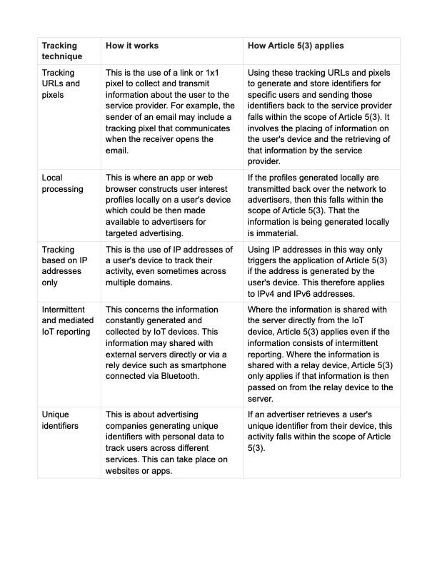 The table below summarises how the EDPB applies its interpretation of Article 5(3) to the technical operations used in various electronic communications services. It includes a description of the operation and how they fall within the scope of the ePD.