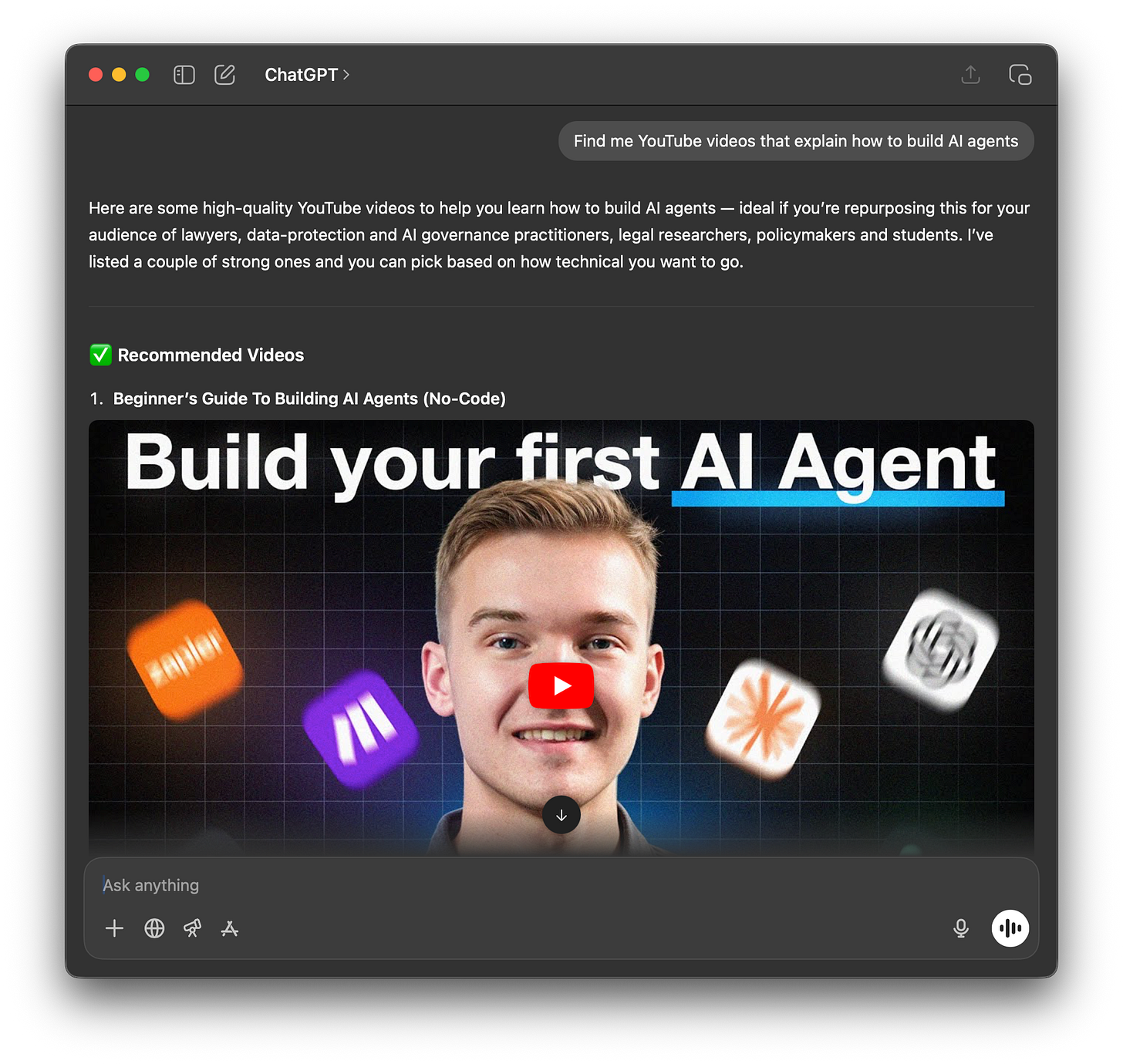 Find me YouTube videos that explain how to build AI agentsThe goal here is for ChatGPT to find videos on building AI agents. The actions it therefore needs to take consists of accessing YouTube and finding videos that match the query (’building AI agents’) and report back on the videos that best match the query. The environment it is operating in is the internet, or more specifically YouTube. The tool it used for this task was the web browsing function built into ChatGPT.