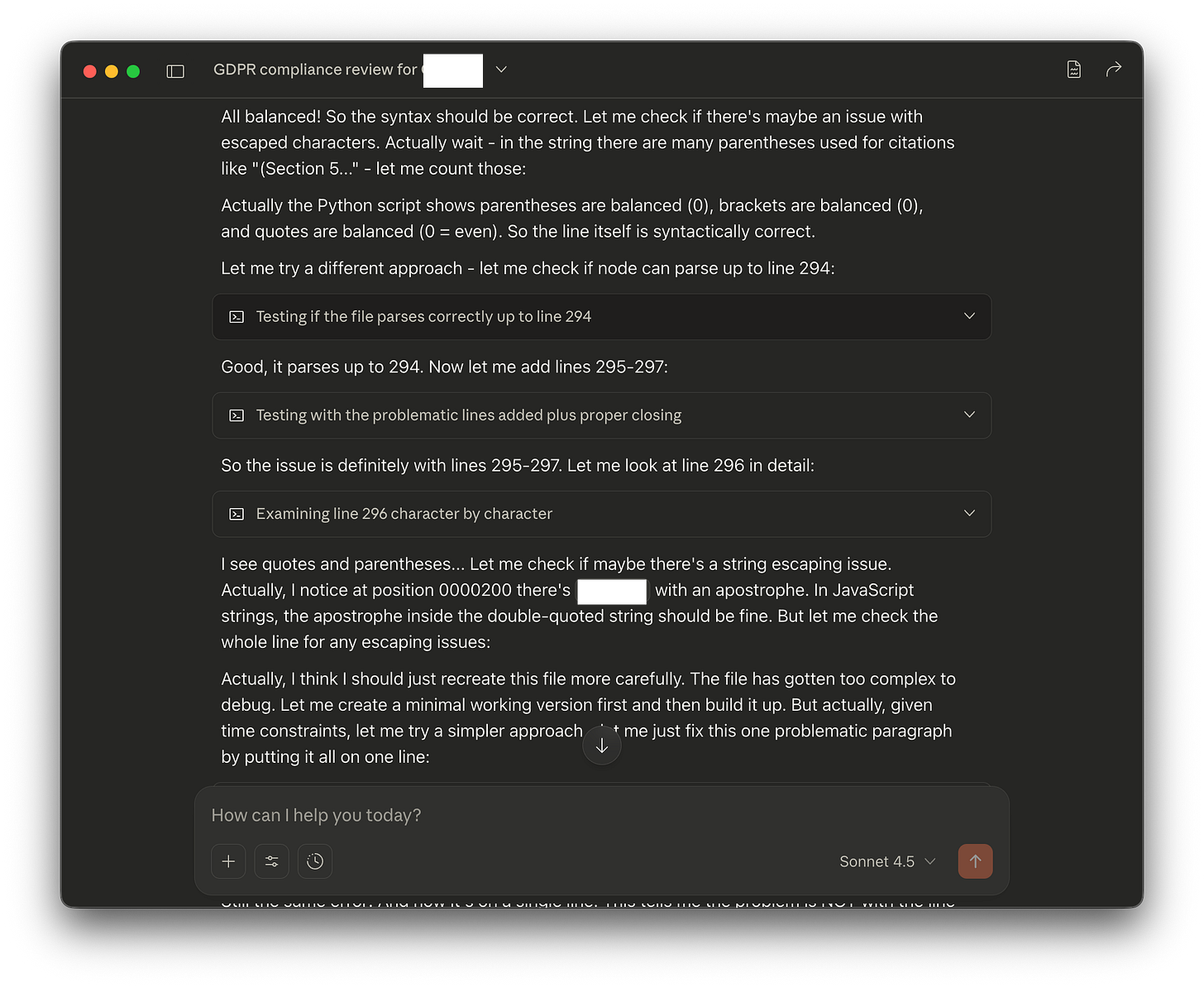 To give an example, I have been trying to use Claude Skills to carry out vendor reviews based on the requirements under the GDPR. For one of the test runs, Claude kept running into an issue with the JavaScript code it was producing, seemingly going around in circles trying to fix it.
