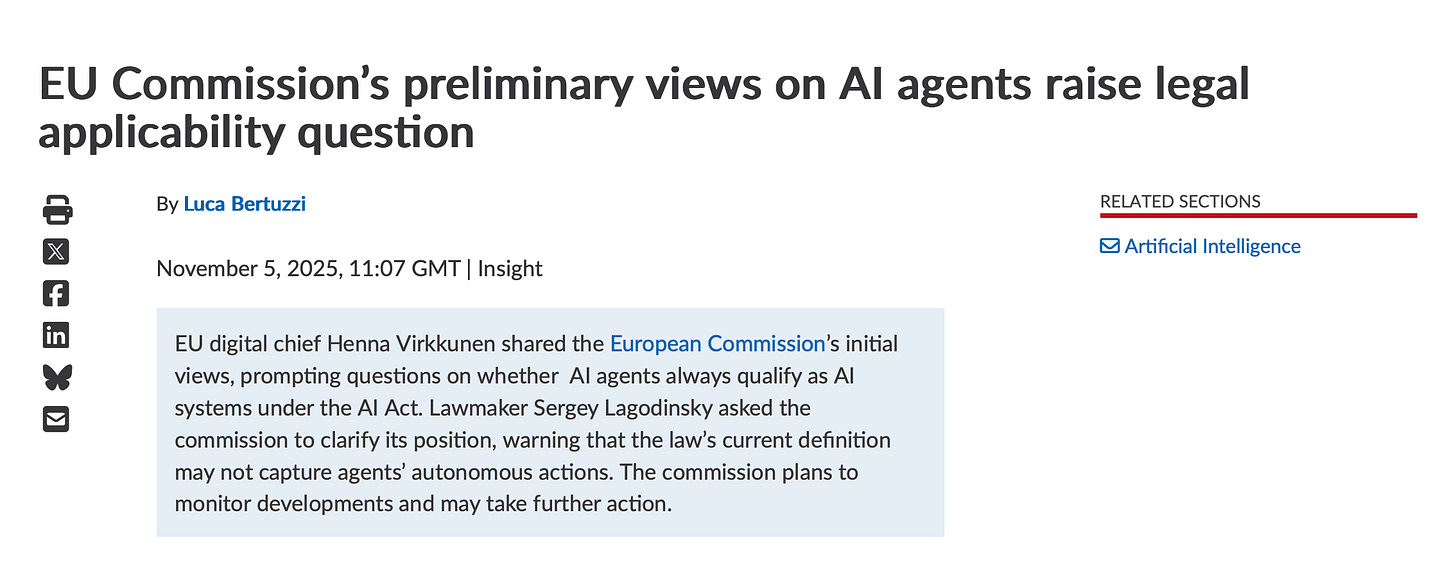 But apparently not so, maybe. Back in September, Sergey Lagodinsky, a member of the European Parliament, wrote a letter to the European Commission regarding AI agents and the AI Act. Lagodinsky’s letter highlighted three main issues with AI agents: