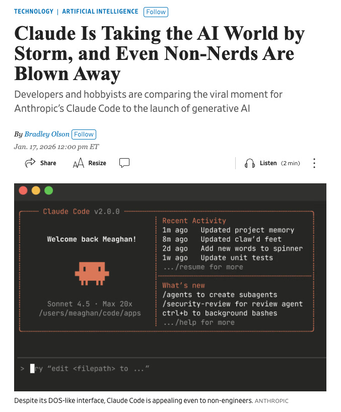 The interesting thing about Claude Code is that, despite it being a coding agent and therefore seemingly only of interest to coders or those more technically capable, it is capturing the attention of those outside the AI bubble. Even the Wall Street Journal is writing about Claude Code, so it must be something cool even among the normies.